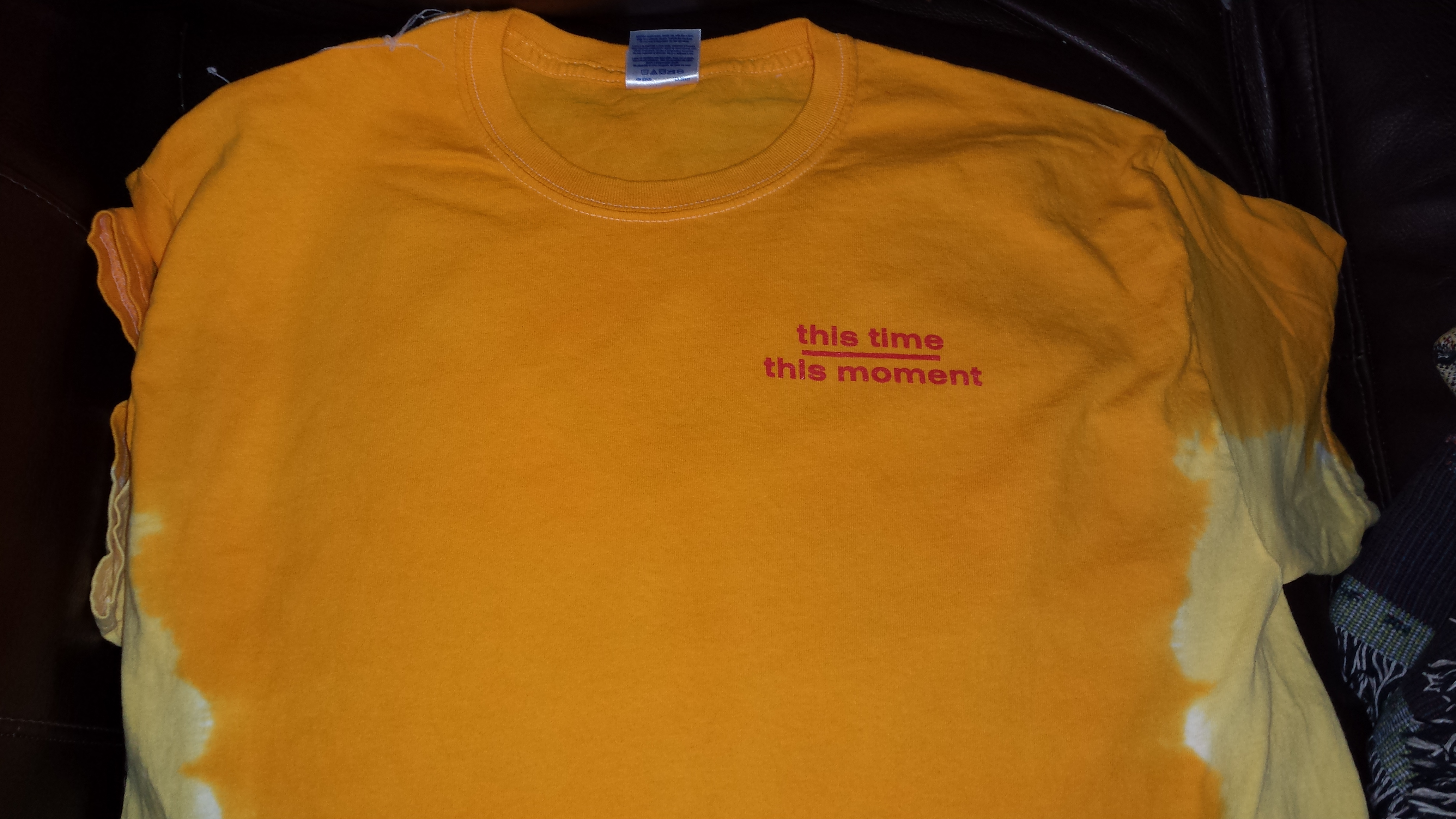 The attached pictures are of the brand new t-shirts I have had created using the awesome Butterfly Dragon image my brother, Jeremy, found for me. This image is on the back of a golden partially tie dyed t-shirt. On the front left pocket are the words “this time/this moment” which has become a mantra for me to stay in the Now, because that is really all that we have. This image and these words have great power for me right now as I rest and recuperate in the ashes/growing soil/egg/cocoon in which I find myself. I feel a great awakening stirring within me, some of which has already occurred. This Butterfly Dragon is the me I hope to become when I am ready to fly into the world. It maybe awhile before I can take full flight but I do feel myself coming out of the Butterfly Dragon egg and starting to stretch my wings into the sun. So, so much power in this image and these words for me, so much!